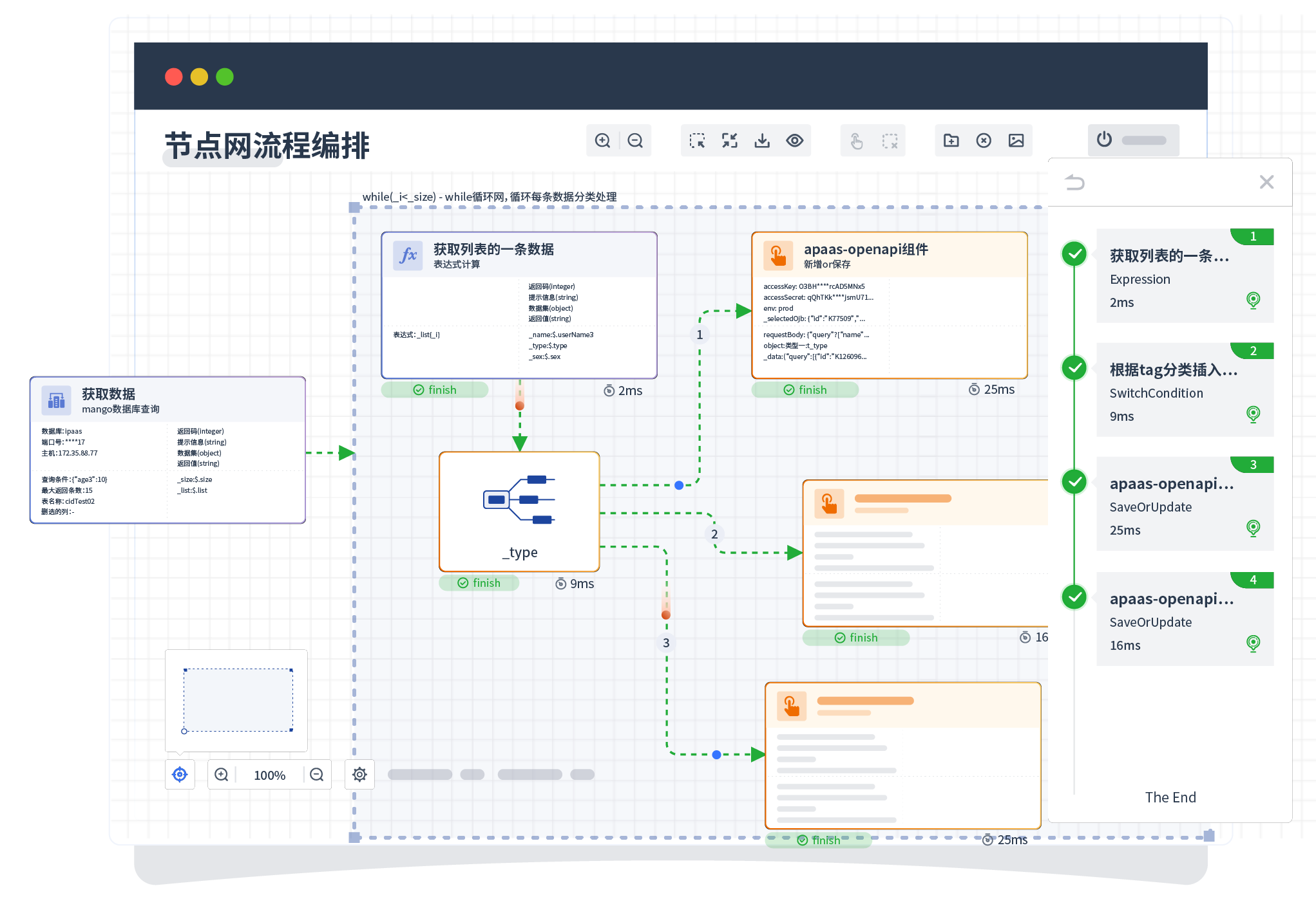 针对集成场景,,,,组件定义后支持进行流程编制,,,,不同于传统代码方式,,,通过图形化展示,,,支持在线调试、、、、日志查看和运行回放。。