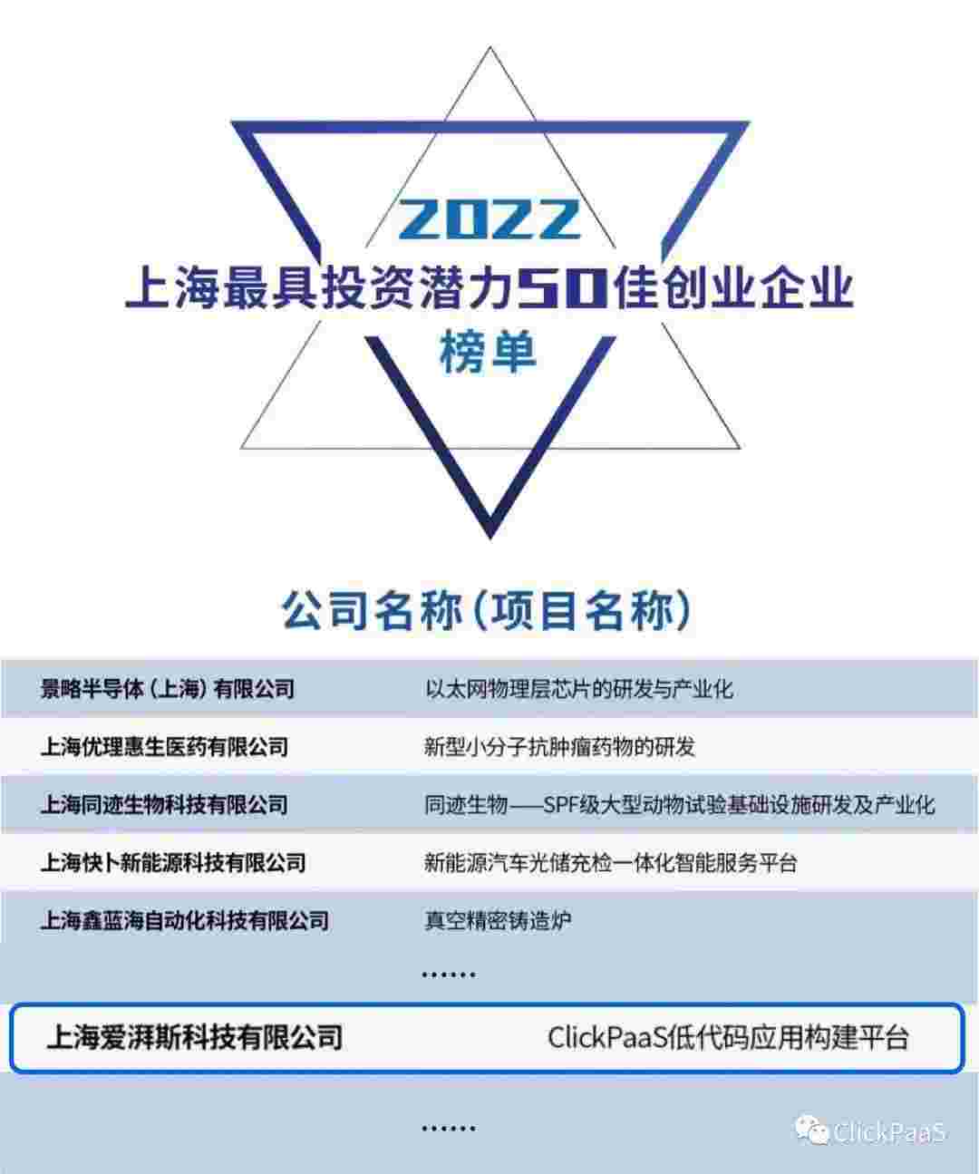 沃钱包 作为国内低代码PaaS平台的领军企业,,,与120家创企入围角逐。。期间接受了来自德同资本、、领中资本等知名投资机构的10位投资人组成专家评委团的背靠背盲选。。。并最终入围“2022上海最具投资潜力50佳创业企业”榜单,,被列入“上海市重点培育创业企业库”。。